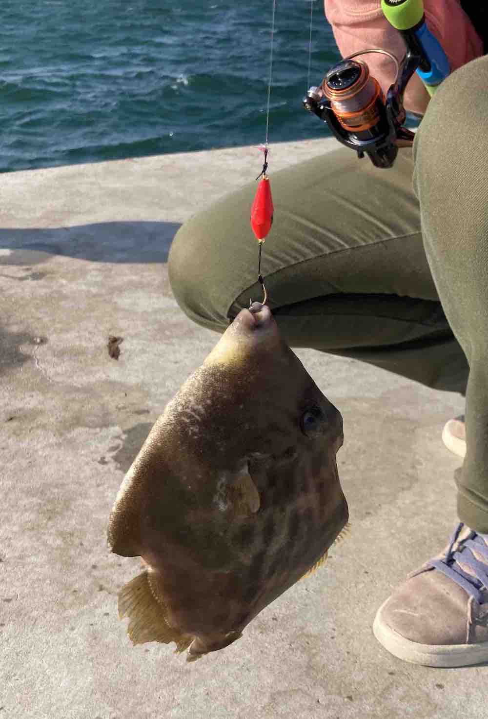 するとグン!と引かれてあげてみると良いサイズのカワハギ。