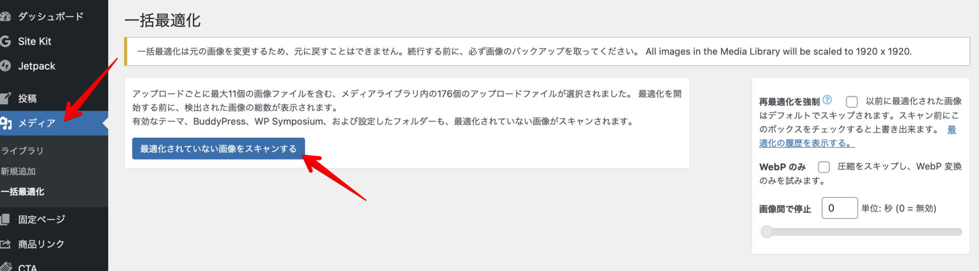 メディアから一括最適化を選び、「最適化されていない画像をスキャンする」を選びます。