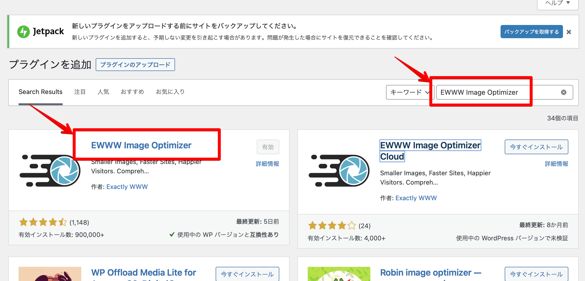 キーワードに「EWWW Image Optimizer」と入力すると候補が出てきますので画像ものを選択してください。