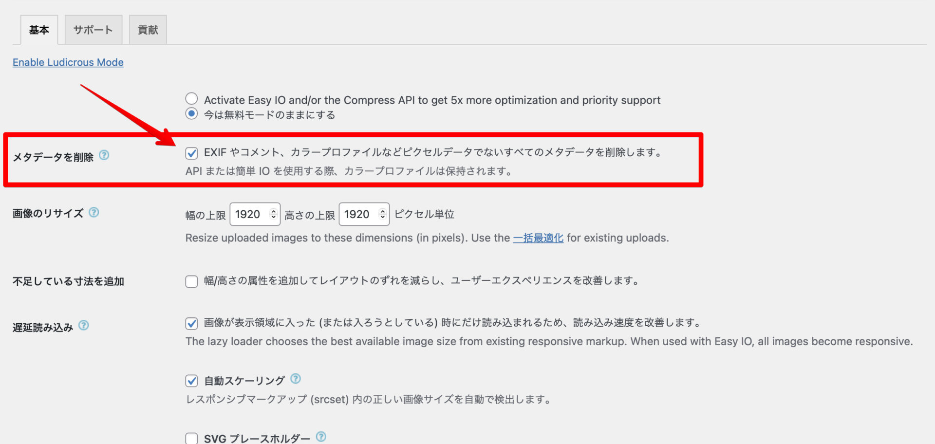 「EWWW Image Optimizer」の設定画面を開き、「メタデータを削除」の項目にチェックを入れます。